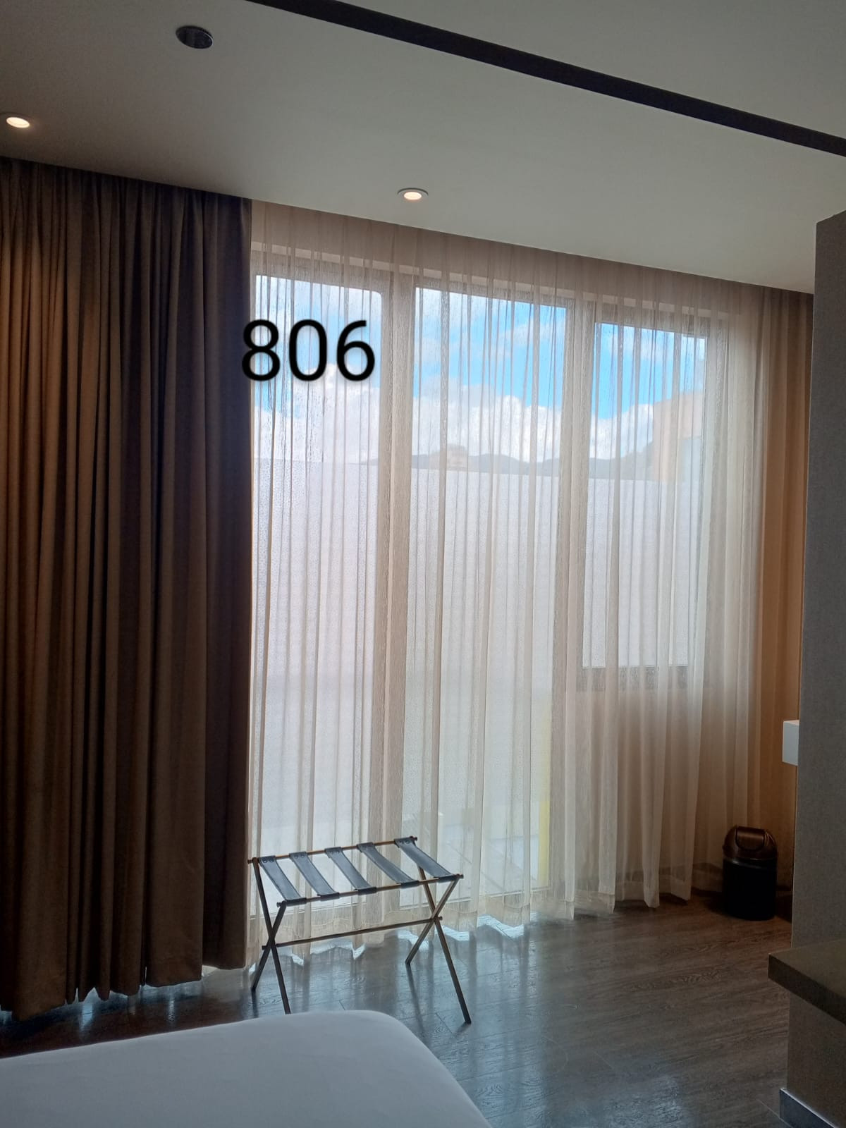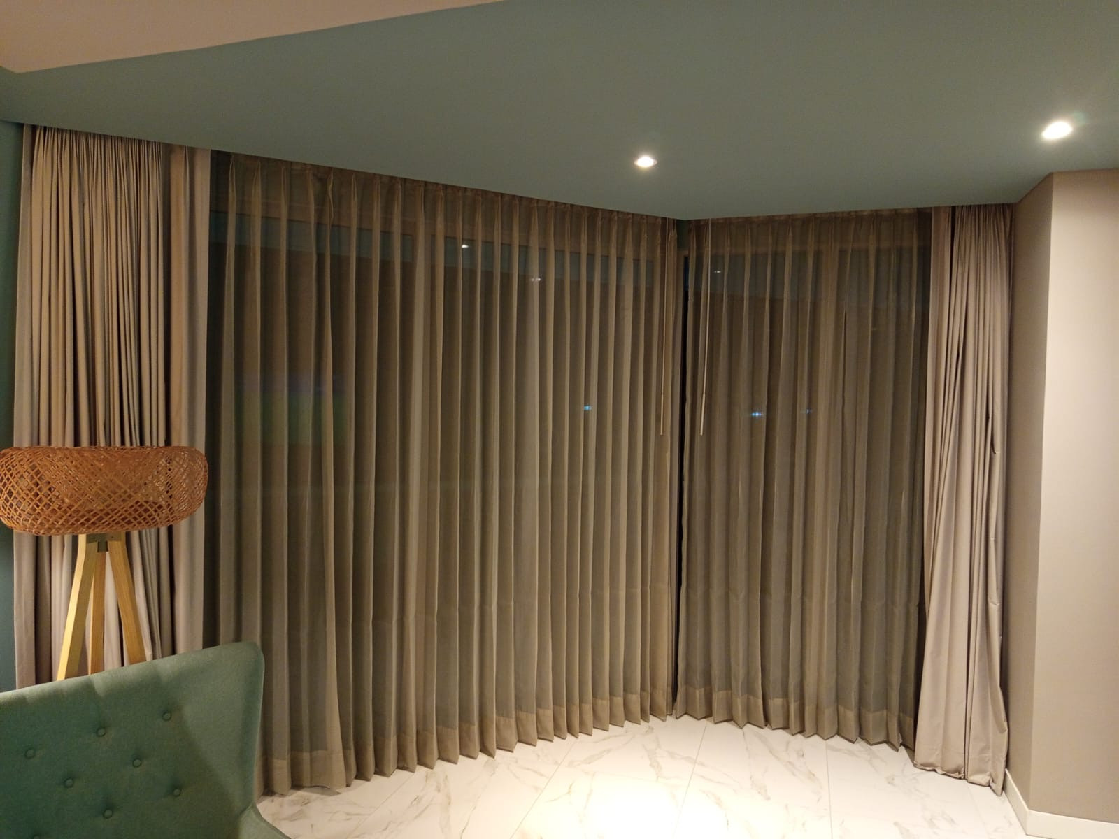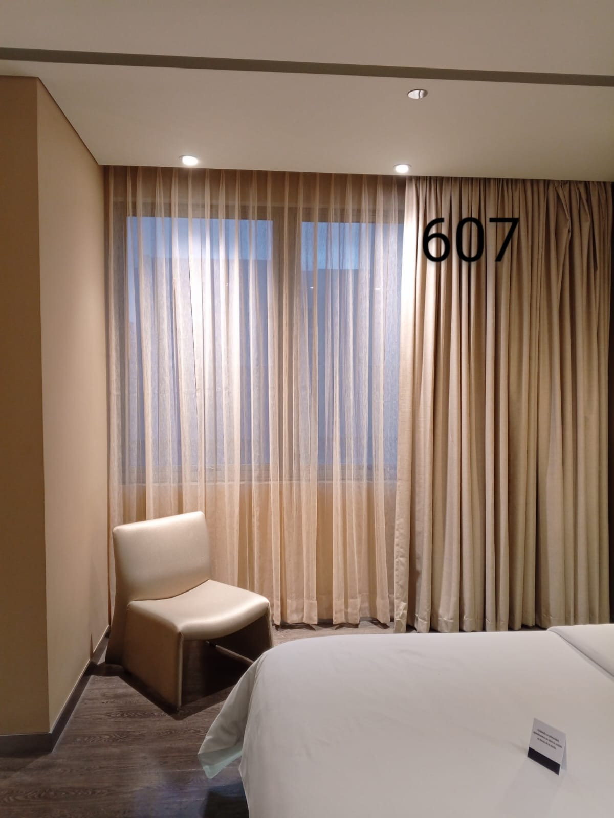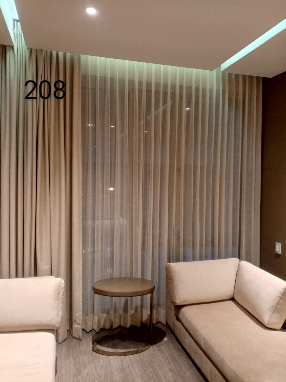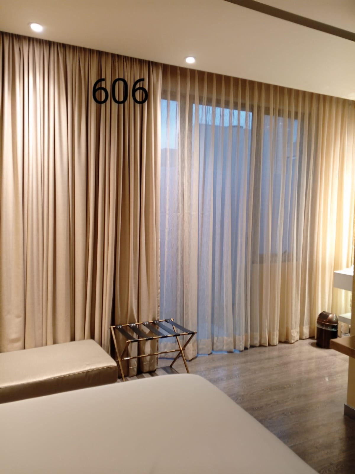 La cortina Hotelera lleva una cinta en la parte superior que se confecciona con un diseño de prenses de dos o tres pliegues, los cuales generan que la tela caiga en forma de ondas. Esta cortna se fabrica con 2 metros de tela por cada metro de riel.