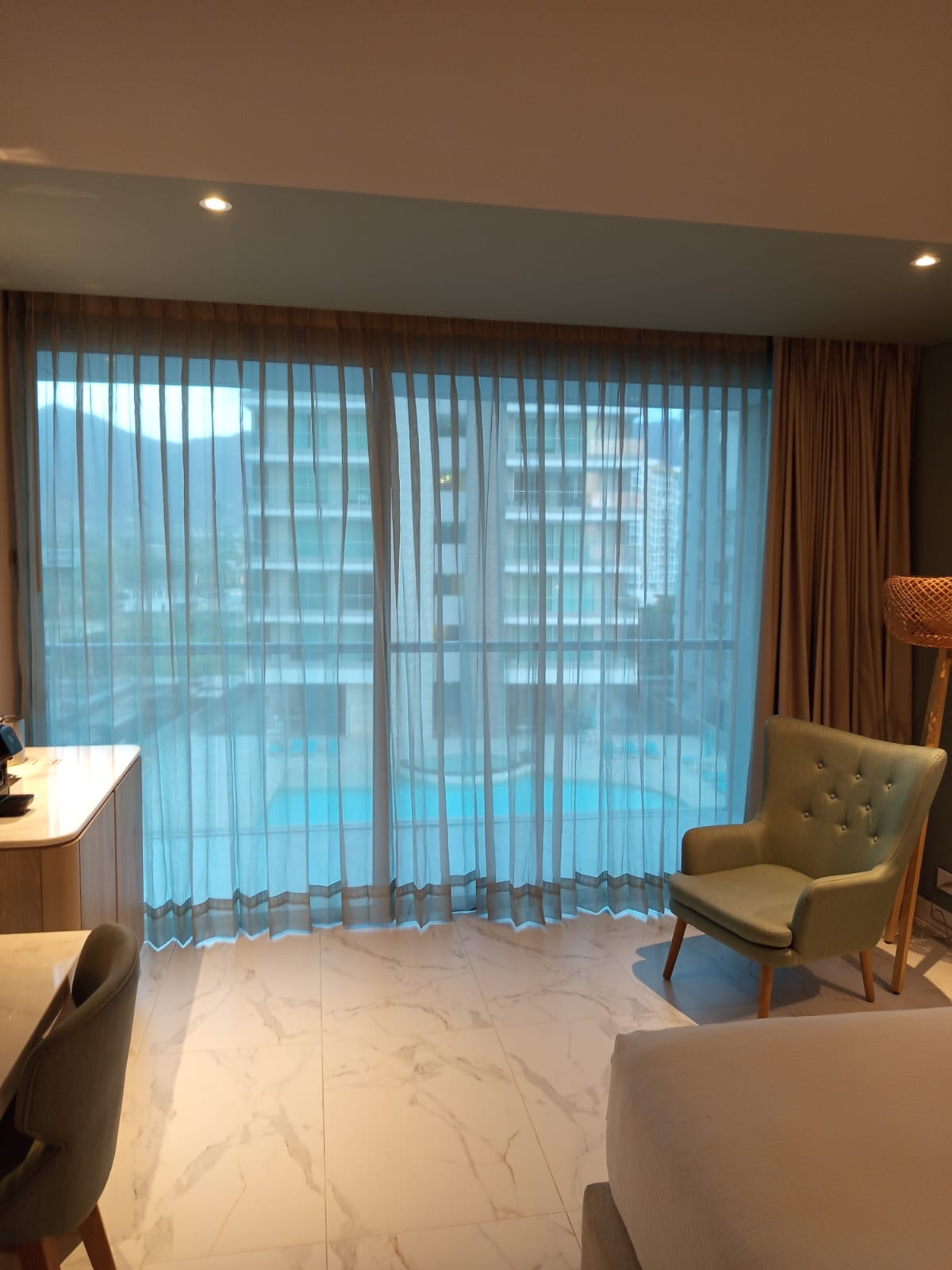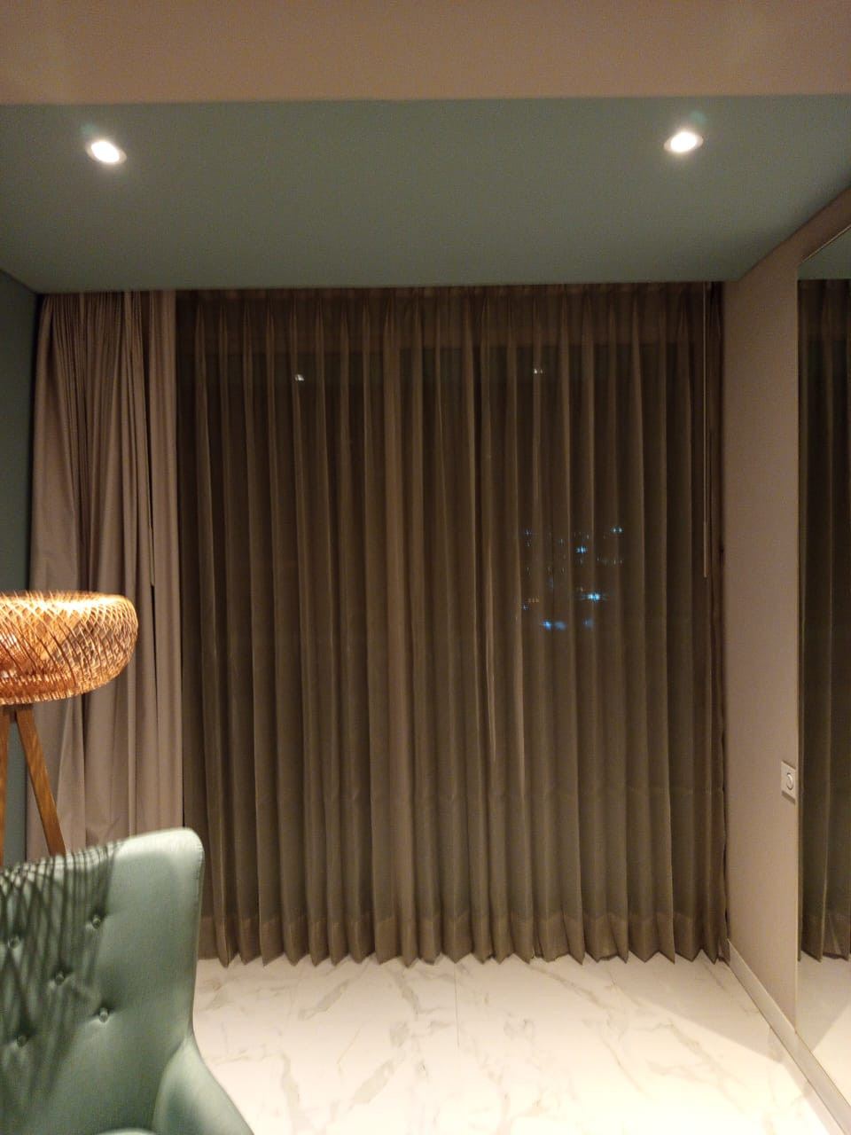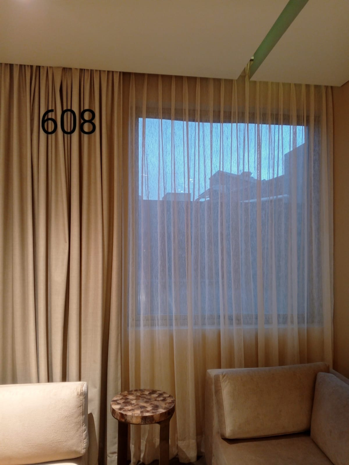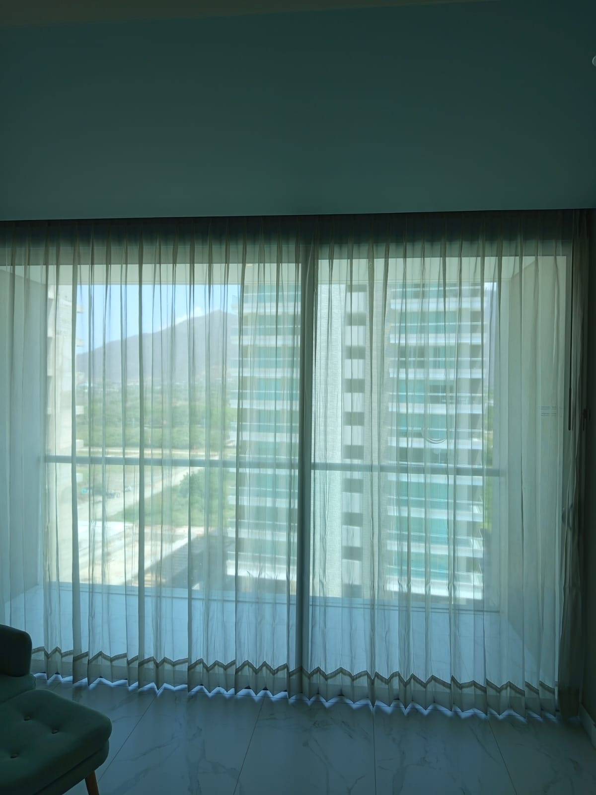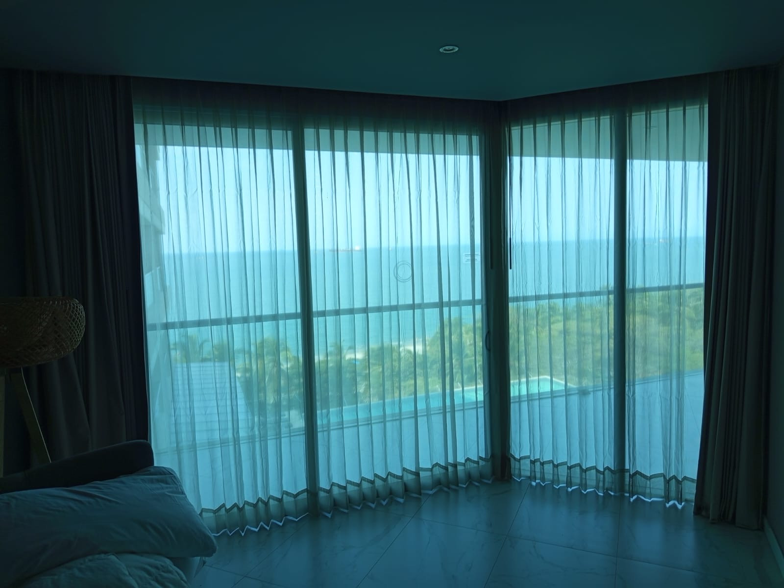 La cortina Hotelera lleva una cinta en la parte superior que se confecciona con un diseño de prenses de dos o tres pliegues, los cuales generan que la tela caiga en forma de ondas. Esta cortna se fabrica con 2 metros de tela por cada metro de riel.