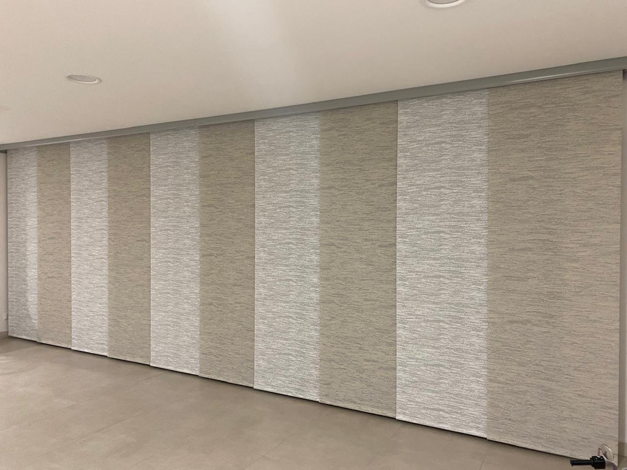 Panel Japonés Los paneles japoneses están especialmente indicados para cubrir grandes ventanales, desde el techo hasta el piso, pero también son aptos para ventanas más pequeñas. se mueven horizontalmente por unas guías o rieles, cruzándose y superponiéndose entre sí para otorgar intimidad e impedir el pasode la luz.